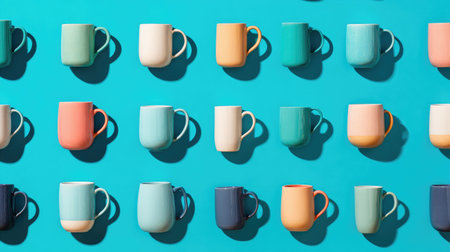 A vibrant display of colorful mugs arranged in a grid on a turquoise background, perfect for adding a splash of joy to any kitchen or dining space.