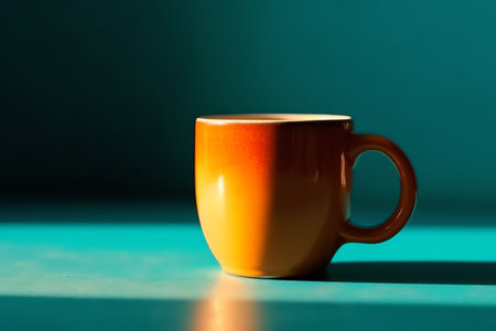 A red coffee cup sitting on a table next to blue wall, AI