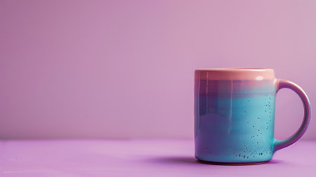 Colorful ceramic mug on purple background with ample negative space