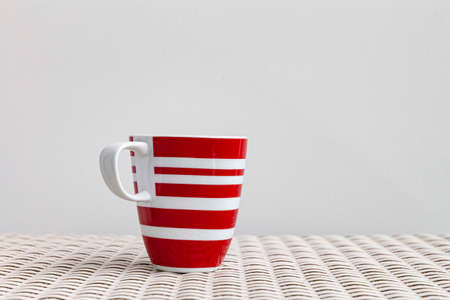 Close-up of grey mug on two backgrounds of red and blue of colors.