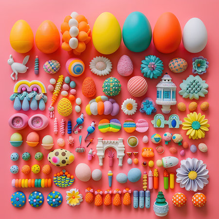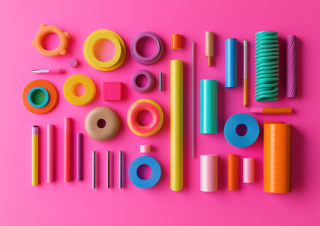 This image showcases a repeating pattern of colorful, textured geometric forms set against a pastel pink background. The composition features a repeating pattern of the objects creating a sense of order. The bright colors and overhead lighting suggest a cheerful, clean environment. Suitable for a wide range of commercial and editorial uses.