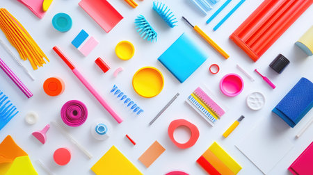 A vibrant arrangement of colorful art supplies and playful shapes, perfect for creative projects. The lively background enhances creativity and fun.