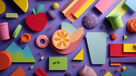 A vibrant, creative flatlay featuring colorful geometric shapes and stationery on a purple background, ideal for arts, crafts, or educational themes.