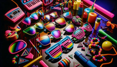 A vibrant summer-themed flat lay featuring sunglasses and colorful accessories like stripes and balloons, set against a bright background.