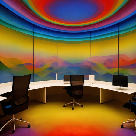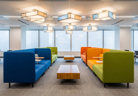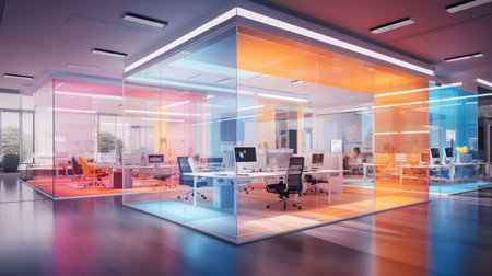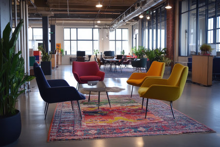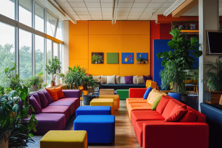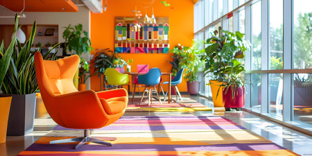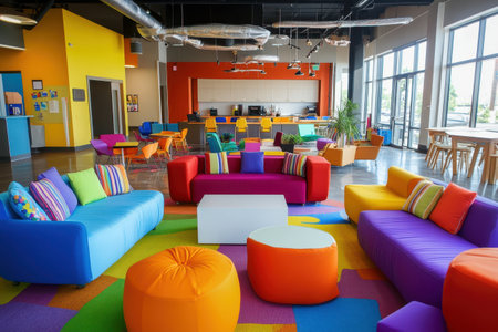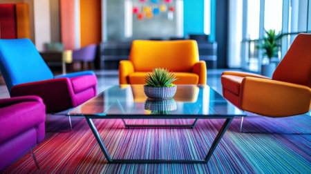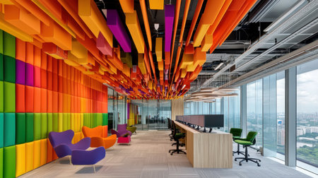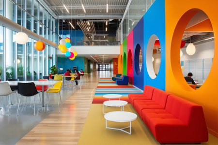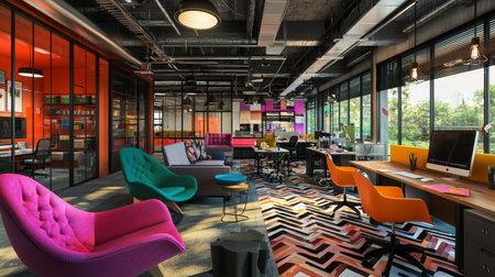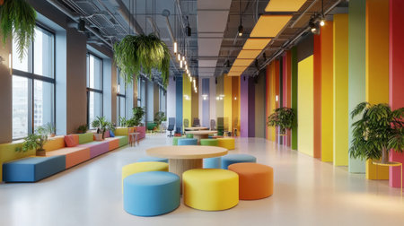 The image showcases a modern office space, featuring a colorful design with contemporary furniture and decor, perfect for advertising or editorial content.