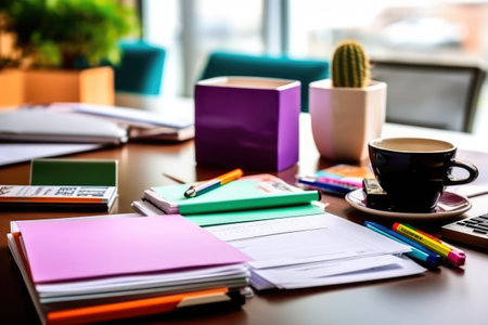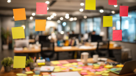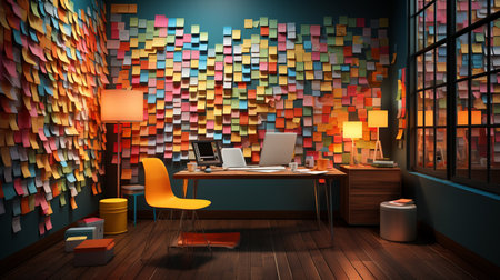 Creative workspace filled with colorful sticky notes, showcasing brainstorming and collaboration. vibrant colors add energy to office environment, enhancing productivity and teamwork