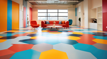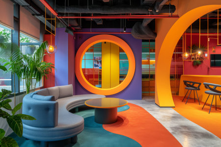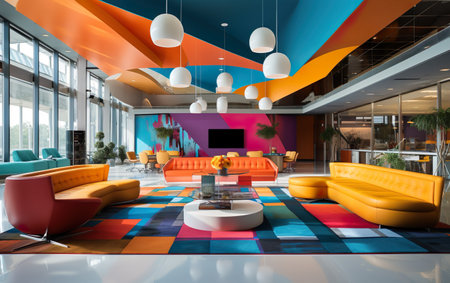 Bright and vibrant office interior with a cozy lounge space and playful geometric designs