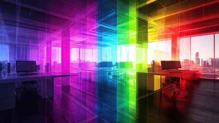 Office interior design. Vibrant colors. Contrasting and balanced tones. Professional, commercial image.