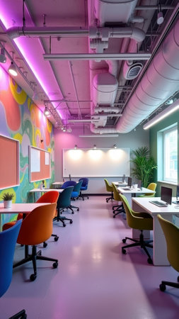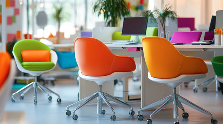 This vibrant office interior features colorful ergonomic chairs and sleek desks. The modern design promotes creativity and productivity in a bright environment.
