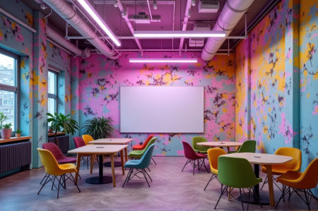 Vibrant modern classroom interior with colorful chairs and artistic walls. That the image is generated using AI.