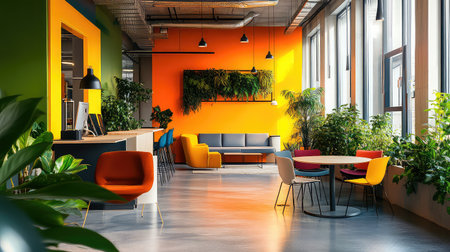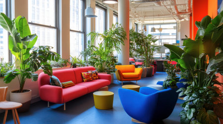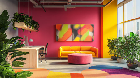 This vibrant office interior features modern furniture in bright colors, lush plants, and creative decor, perfect for inspiring productivity and collaboration.