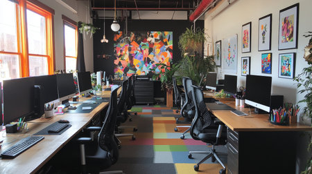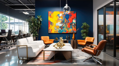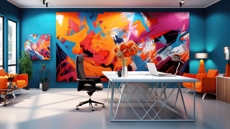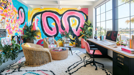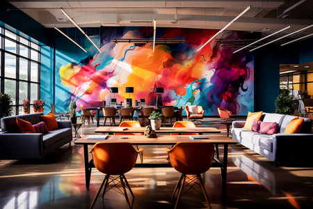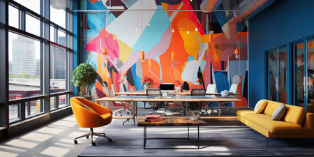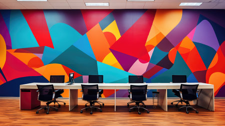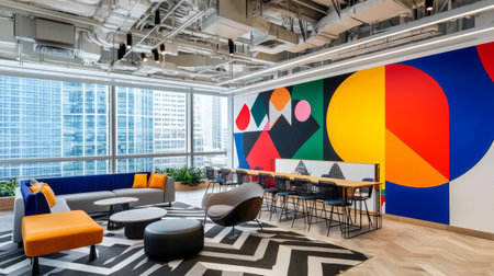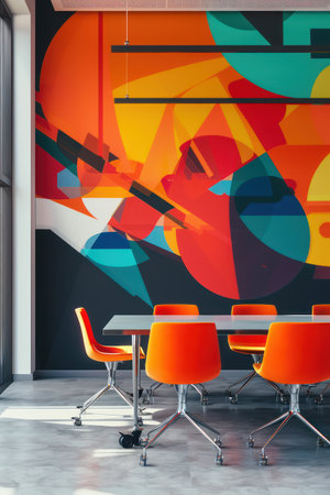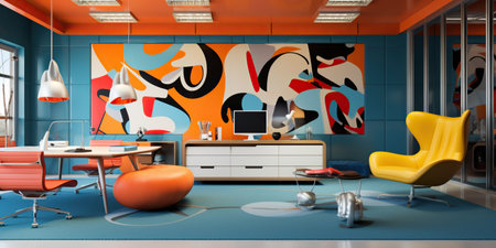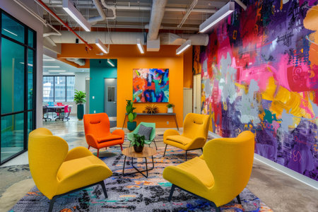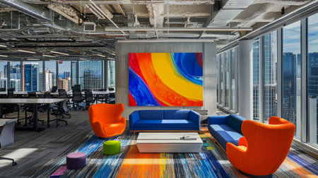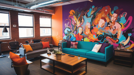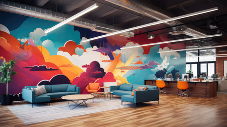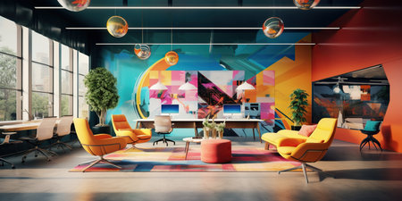 Discover a vibrant office interior that blends modern design with creative elements. A perfect space for collaboration, featuring colorful artwork and comfortable seating.