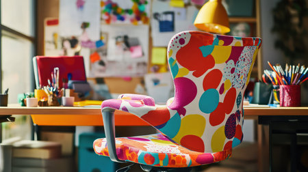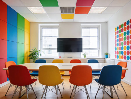 In a colorful office, desks and chairs are neatly arranged, but there is nobody in sight. The vibrant atmosphere awaits the hustle and bustle of a busy workday. Generative AI