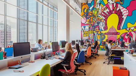 A vibrant modern office fosters creativity and collaboration among diverse professionals.