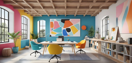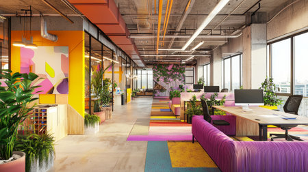 Discover a vibrant and colorful modern office that promotes creativity and collaboration. Featuring ergonomic desks, dynamic artwork, and lush plants for inspiration.