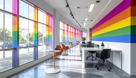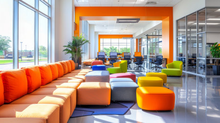 Bright and inviting office interior featuring vibrant colors, sleek furniture, and abundant natural light, creating a modern and productive workspace ideal for professionals.