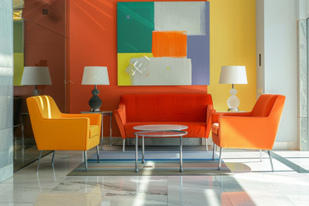 This modern office interior showcases colorful furniture and a large abstract painting, creating a vibrant space that encourages creativity and collaboration among team members.