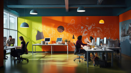 Vibrant coworking office space with colorful walls, creative decor, and versatile furniture arrangements to inspire collaboration