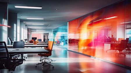 In a colorful office, desks and chairs are neatly arranged, but there is nobody in sight. The vibrant atmosphere awaits the hustle and bustle of a busy workday. AI Generative AI
