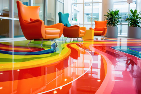 Colorful chairs in a room with a rainbowlike floor. Orange, building, design, houseplant, flooring, leisure