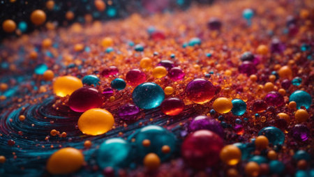 AI Generated. Close-up of colorful drops liquid bubbles molecules background