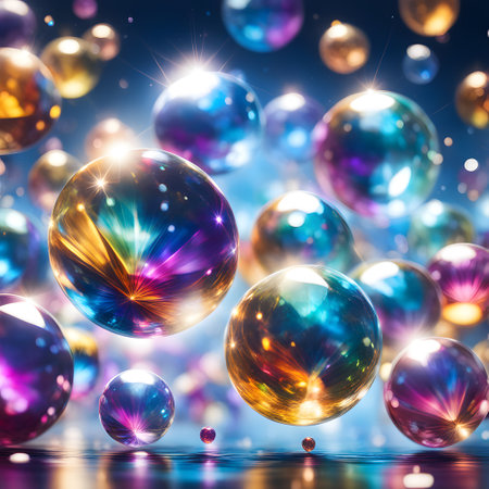 Floating spheres, iridescent, night sky, reflected light, abstract background