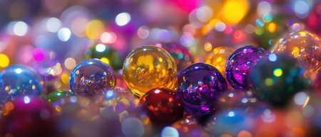 Shiny multicolored spheres in vivid hues, arranged in an abstract pattern, reflecting saturated colors and a playful, marble-like design.