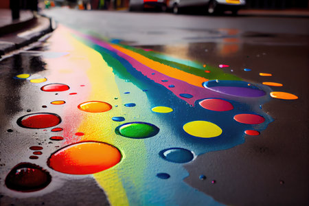 a close-up of rainbow paint on a wet street, with raindrops creating new patterns as they hit the surface., created with generative ai