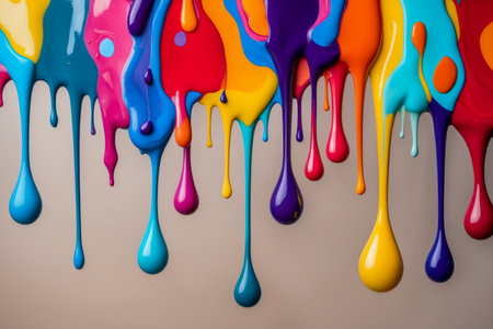Vibrant colorful paint drips suspended against a dark background with glossy droplets reflecting light.