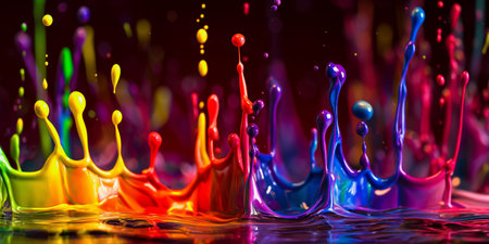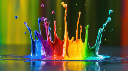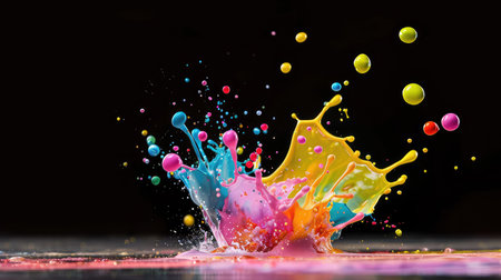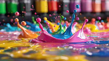 A stunning capture of a vibrant paint splash showcasing a dynamic burst of colors and playful droplets. Ideal for art and creativity themes.