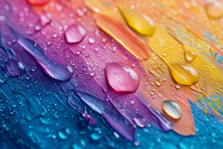 Brightly colored waves of paint are covered with water droplets, creating an eye-catching abstract effect. The vivid colors blend together beautifully, showing artistic expression.