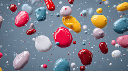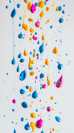A vibrant collection of colorful paint droplets suspended in mid-air creates an abstract, dynamic scene. Perfect for artistic projects and contemporary designs.