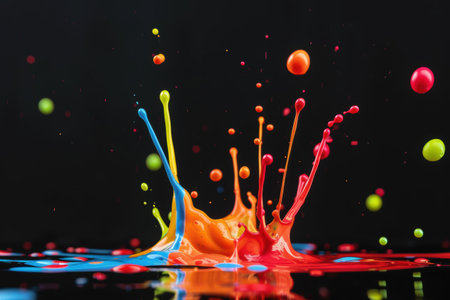 Bright, bold colors mix and collide, creating stunning splashes against a dark background. This energetic display captures the joy of artistic expression through liquid motion.