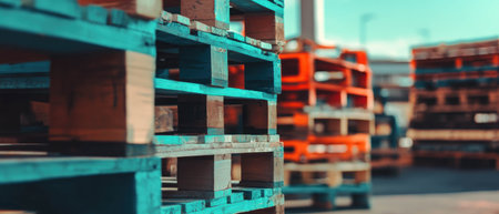 Vibrant close-up view of colorful shipping pallets stacked in a warehouse environment