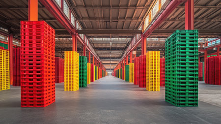 This vibrant industrial warehouse features colorful stacked plastic pallets in red, yellow, and green, creating a striking visual effect in a well-organized space.
