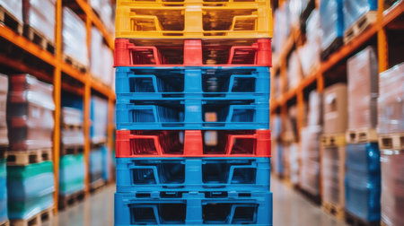 A vibrant arrangement of colorful plastic pallets stacked neatly in a modern warehouse, surrounded by organized shelves filled with various goods and products.