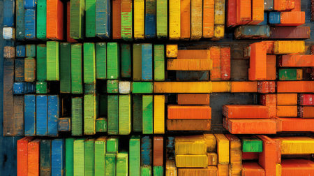 This stunning aerial view captures a vibrant arrangement of shipping containers in a busy port, reflecting the complexities of logistics and global trade.
