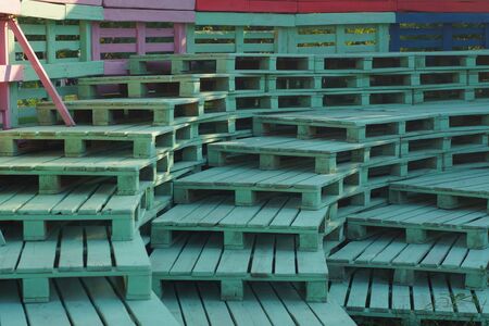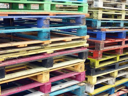 Close up stack of many vivid multicolor painted colorful wooden pallets, high angle diagonal view