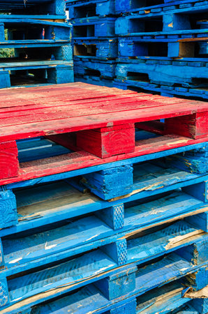 Wooden Pallets In Color Blue Light Red Closeup on a streed slighty used and torn