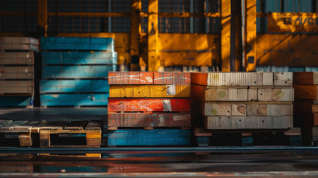 Colorful wooden pallets stacked in an industrial warehouse, illustrating themes related to storage, logistics, and manufacturing.