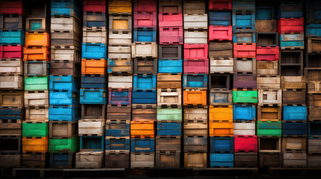 A vibrant display of colorful wooden crates stacked in a neat grid pattern, showcasing their varied textures and hues.