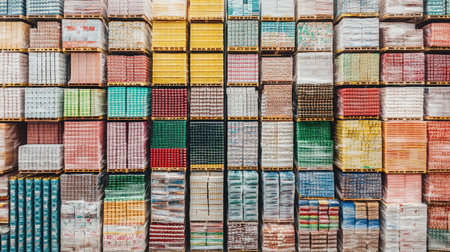 A well-organized warehouse storage area showcasing a vibrant arrangement of boxes in different sizes and colors. Ideal for logistics and distribution themes.