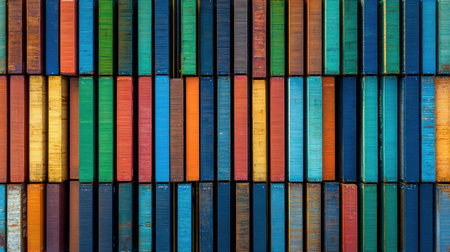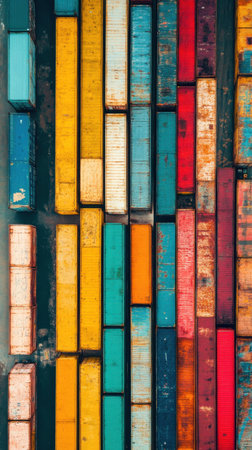 A visually striking image featuring a densely packed arrangement of shipping containers, showcasing a vivid spectrum of colors that evoke industrial and maritime themes.