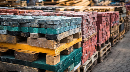 A vibrant display of colorful paving stones stacked on wooden pallets showcases various textures and patterns, ideal for outdoor paving and construction projects.
