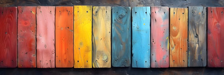 A series of wooden planks painted in vibrant colors lined up to create a colorful and textured wooden surface.