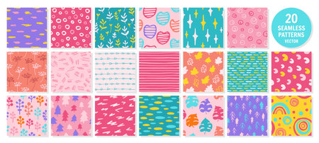 Abstract seamless patterns set with grunge shapes and doodle objects. Hand drawn paint brush stroke scribble curve color endless ornament collection. Kid curved line texture. Vector isolated decor