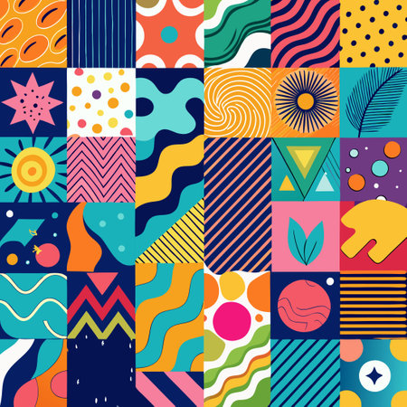 A colorful grid of abstract art with bold shapes, bright colors, and playful patterns