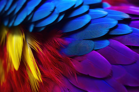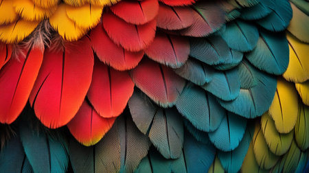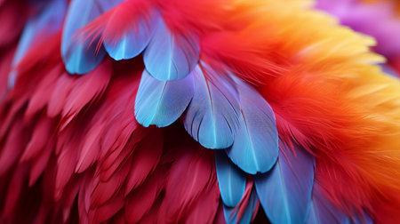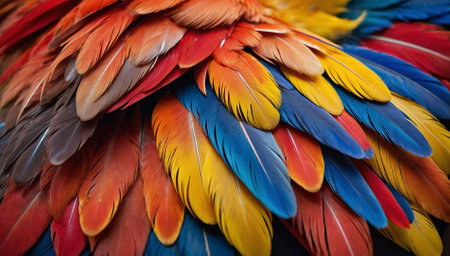 A captivating closeup of vibrant feathers in blue, red, and yellow hues. This stunning texture showcases the beauty of nature, ideal for diverse creative projects.