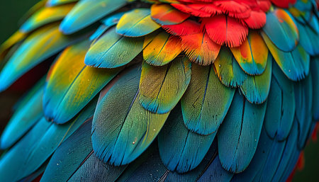 A close view of brilliantly colored feathers reveals intricate patterns and textures, emphasizing the beauty of nature and avian diversity.