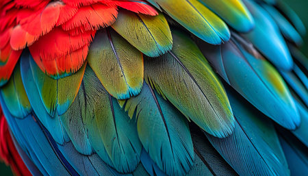 A stunning macro view reveals the intricate and vibrant tapestry of a tropical birds plumage. Each feather is a brushstroke of color, from fiery red and sunny yellow to deep turquoise and emerald green, creating a natural abstract masterpiece.